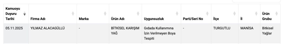 Manisa, Turgutlu’da Yılmaz Alacagüllü’nün adına kayıtla şirkette, Bitkisel Karışım Yağ’da gıdada kullanımına izin verilmeyen boya tespit edildi. Ürün, “Bitkisel Yağlar” kategorisinde yer alıyor.