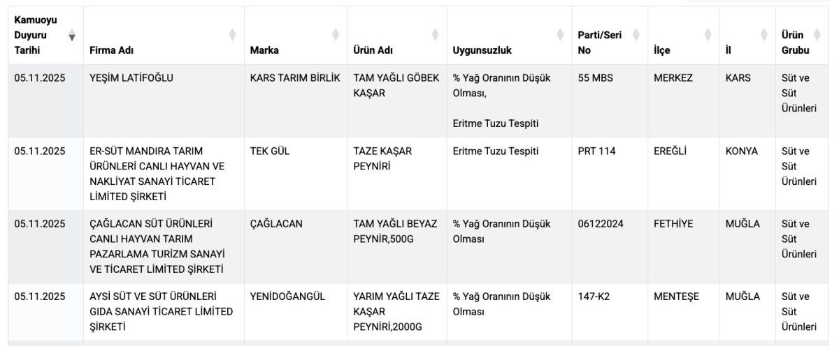 Muğla, Fethiye’de Çağlacan Süt Ürünleri’nde Tam Yağlı Beyaz Peynir’de (500 g), Ürünün yağ oranının olması gerekenden düşük olduğu açıklandı. Parti tarihi: 06.12.2024.